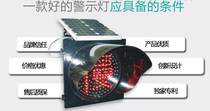 太陽能信號燈是由太陽能板,蓄電池,控制器,LED信號燈組成的發(fā)光警示標(biāo)志,產(chǎn)品常年不適用市電,有太陽能板發(fā)電,蓄電池儲存,陰雨天可連續(xù)適用7天左右。